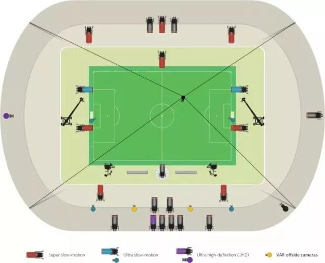 視頻助理裁判團(tuán)隊(duì)可以使用33個(gè)電視轉(zhuǎn)播信號(hào)的機(jī)位,其中八個(gè)具有超級(jí)慢動(dòng)作(super slow-motion)功能,六個(gè)具有極致慢動(dòng)作(ultra slow-motion)功能