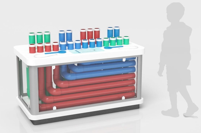 展項由不同長度的彎曲管道、展臺、拍子等部分組成,臺體未封閉可直觀觀察管道形狀。伸出臺面的管口與展臺上貼的音符一一對應(yīng),拍子通過伸縮繩固定在臺面上,防止掉落遺失。參與時,體驗者拿起拍子,通過拍打不同的管口時,將會聽到不同音調(diào)的聲音,觀眾可以自由發(fā)揮拍打管口拍出一個曲子,還可以根據(jù)臺面上的樂譜演奏出一首樂曲。