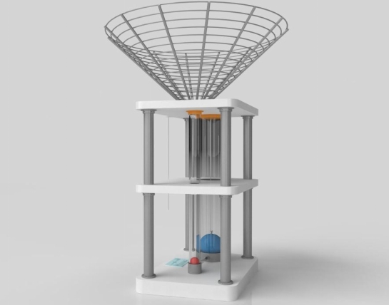 根據理想氣體定律公式可得:當溫度保持不變時,壓強和氣體體積成反比,氣體體積越小,壓強越大。展項中,當我們松開繩子使頂端的圓盤迅速落下時,粗管內的氣壓瞬間變大,空氣被迫壓入窄管,推動小球向上運動,小球彈射而上。當小球撞到擋網上后,沿著漏斗型防護網又落回窄管內。