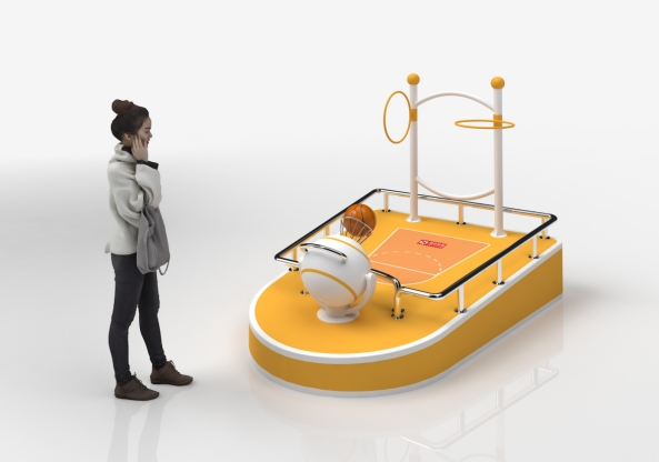 展示伯努利原理和地球引力。投籃器噴出的氣流遵循伯努利原理,即上噴氣流在自由空間受到球體阻擋而向四周自然擴散過程中,氣流外圍速度變小,而氣流中心處的氣流速度則較大。按照伯努利原理:氣流速度快,氣壓就低。小球在低壓區(qū)就被氣流“吸住”懸浮在空中,但是受到地球引力的作用,球的自重又將使球掉向地球。所以巧妙掌握好氣流壓差和球體自重的關(guān)系,就可以將球投進籃筐。