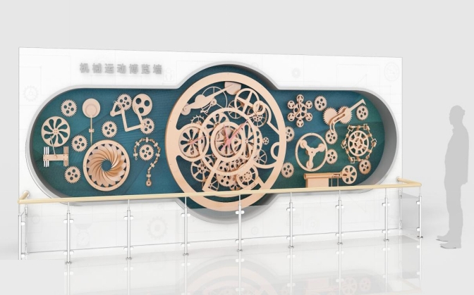 展墻上的所有傳動機構(gòu)均可運動,由背部電機驅(qū)動,部分傳動機構(gòu)在展墻背部通過鏈傳動連接,傳動平穩(wěn),可靠性高。中間的鐘表機構(gòu)可以真實反應(yīng)時針、分針、秒針的運動關(guān)系,并且,時針分針可手動調(diào)節(jié)時間,指針背后齒輪可以嚙合運動,展示鐘表內(nèi)部機芯運動。