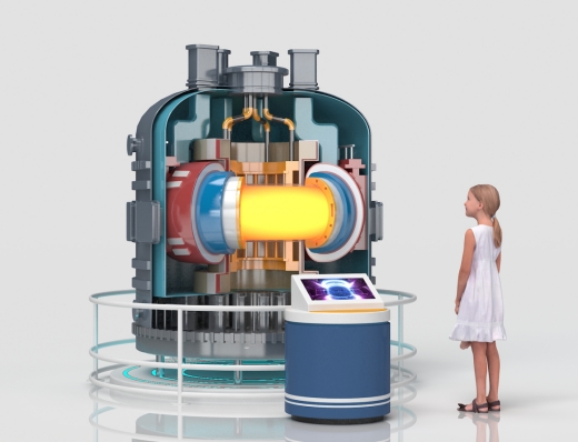 展項主體由托卡馬克可控核聚變裝置模型、觸摸顯示器組成。托卡馬克模型借用燈帶形式將內(nèi)部構(gòu)造逐層表示出來。體驗者觀看核電站模型, 觸摸顯示器了解相關(guān)知識的介紹,啟動核反應(yīng)堆產(chǎn)生能量,并將產(chǎn)生的電能數(shù)值顯示前面的小視屏中。